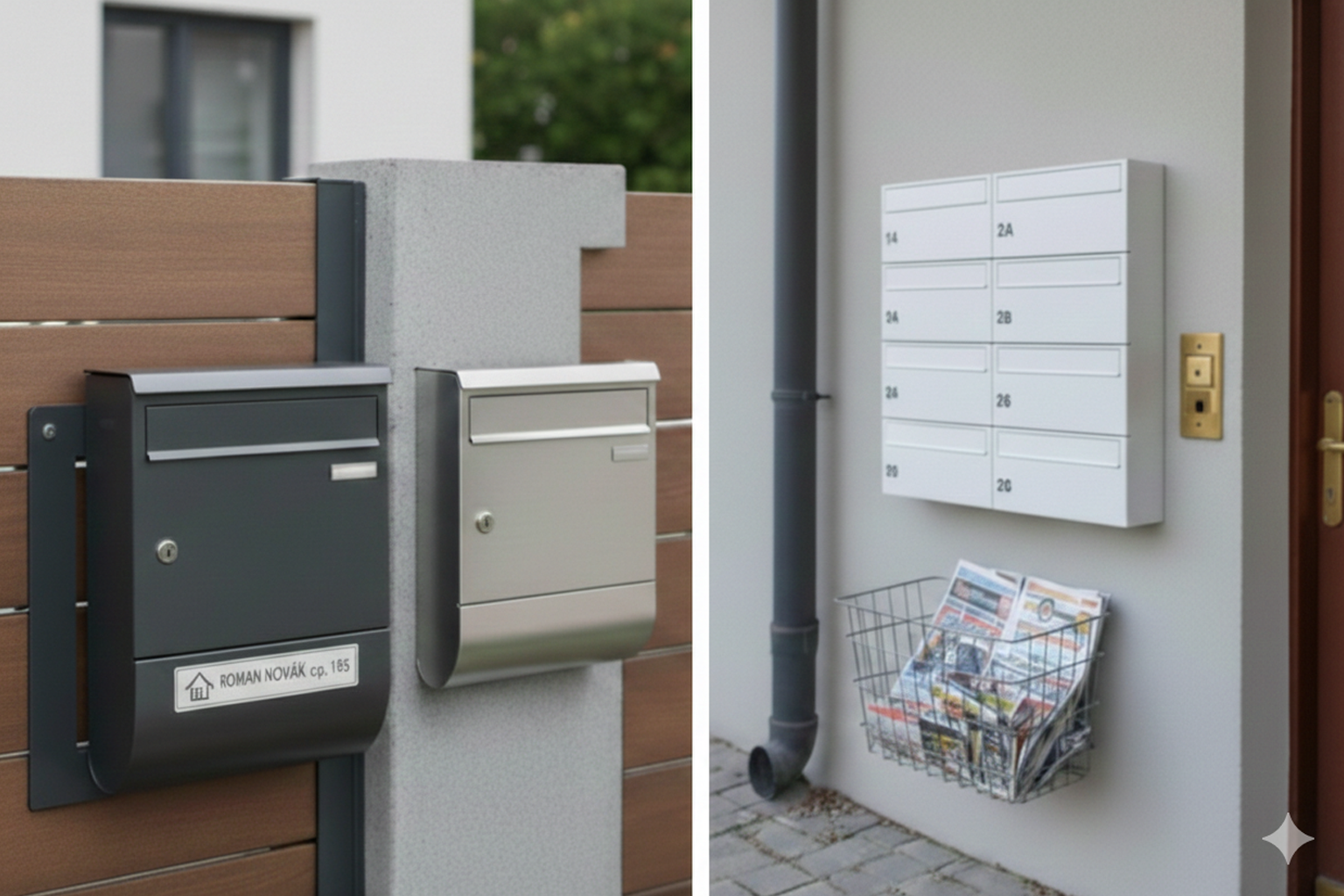 - Cutii poștale de perete (pentru case): Modele clasice care se montează direct pe fațadă, gard sau poartă.