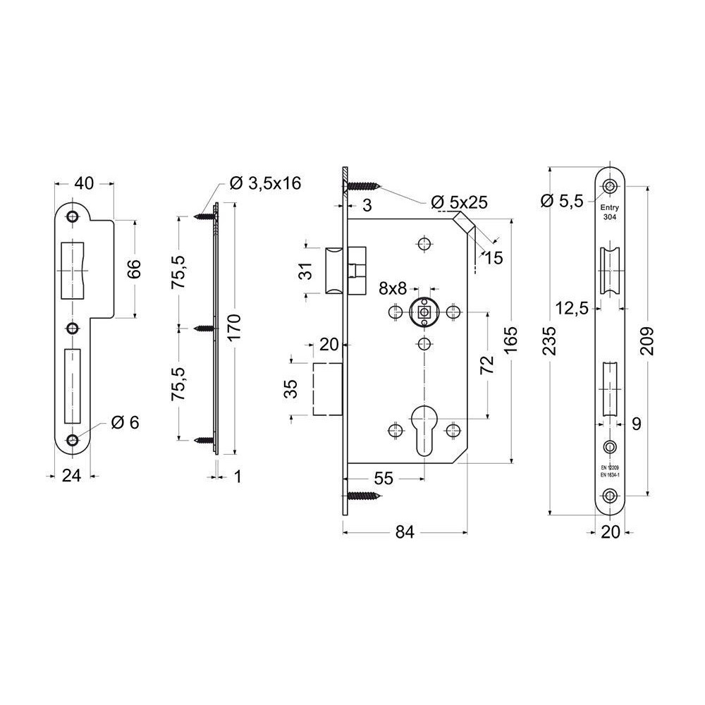 EN.304.PA.KL.72.55.20.PL broască pentru ușă, Inserție cilindrică PZ