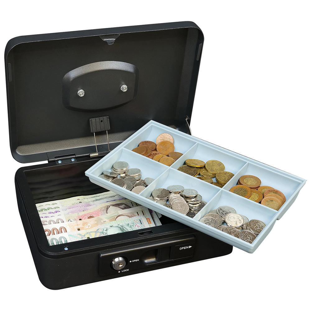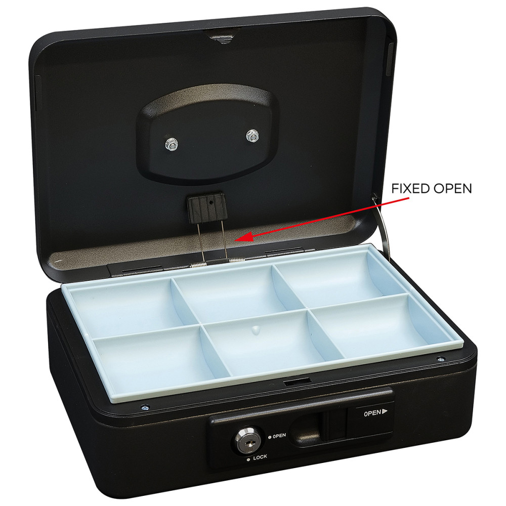 Pușculița din oțel este echipată cu o pârghie externă pentru deschiderea automată și ușoară a capacului. După închidere, capacul se blochează automat, ceea ce permite transportul în siguranță, fără a fi nevoie să fie blocată cu cheie.