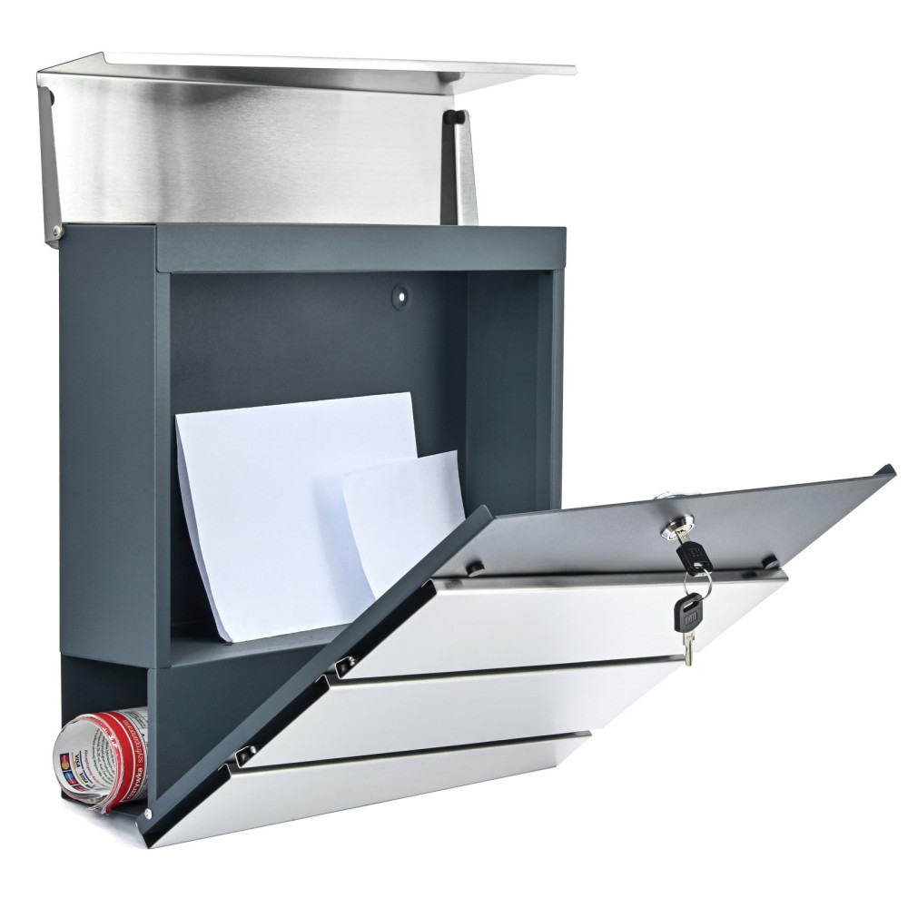 Cutie poștală, combinație de oțel inoxidabil și antracit. Datorită folosirii unui material adecvat, cutia este rezistentă la condițiile meteorologice și vă va servi mult timp. Dimensiunea cutiei poștale asigură că cantități mari de e-mail pot fi primite fără probleme. Prevazut cu un alt compartiment pentru ziare si pliante mai mari. De sus, toată corespondența este foarte bine protejată de umiditate și ploaie. Combinația de oțel inoxidabil și antracit surprinde tendința actuală de culoare a ferestrelor și gardurilor. Cutia contine elemente de montare in spate - pentru o instalare si mai rapida si mai usoara.