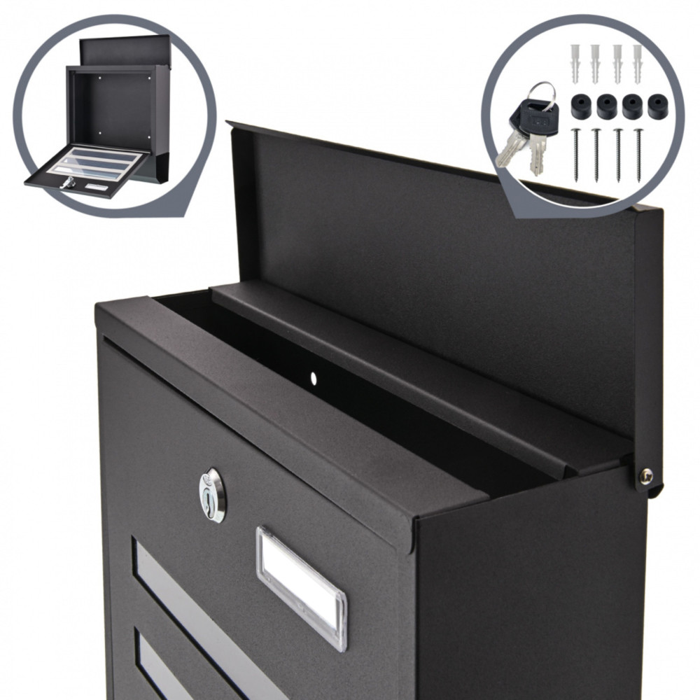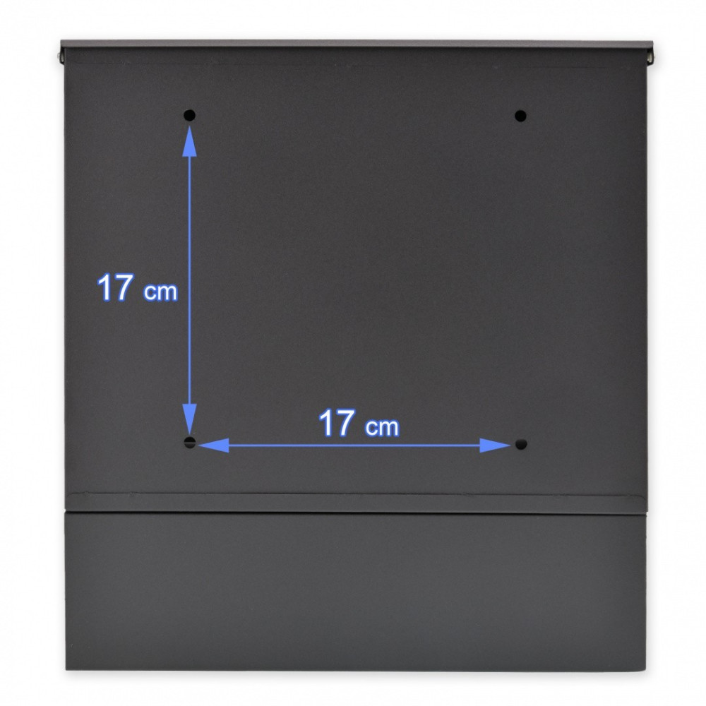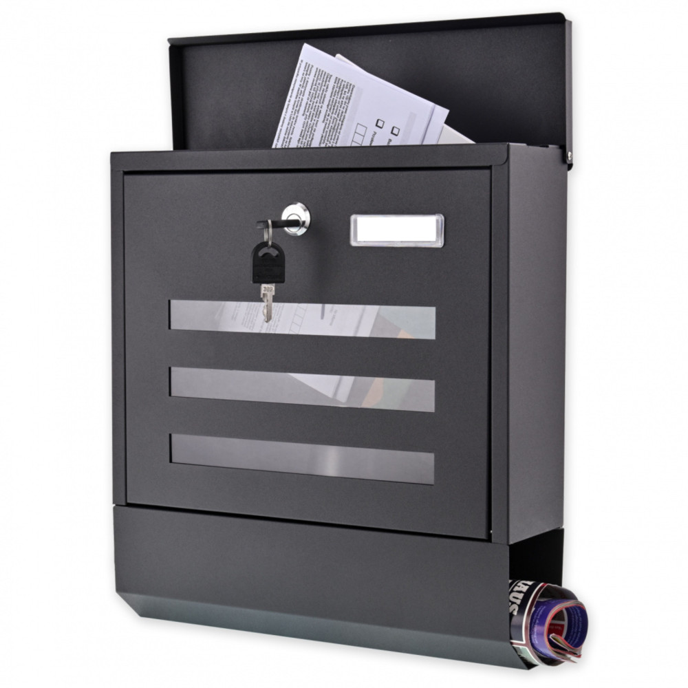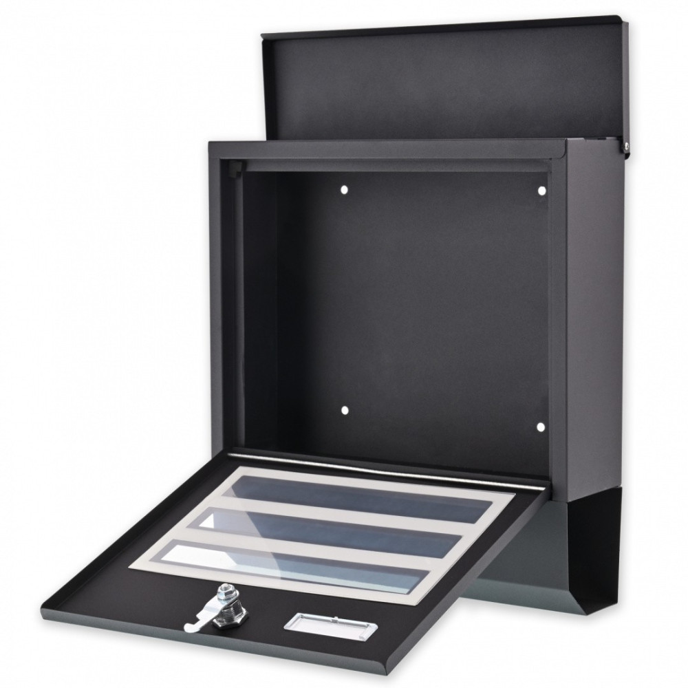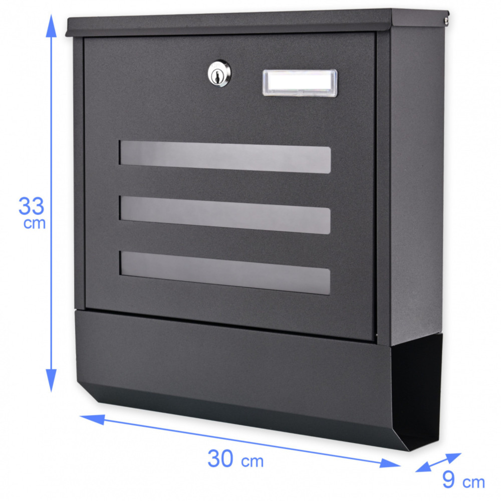 Cutie din tablă de oțel de înaltă calitate în negru. Oferă confort utilizatorilor datorită celor 3 ferestre longitudinale proiectate cu posibilitatea de vizualizare în interiorul cutiei. Această caracteristică vă permite să verificați conținutul clipboard-ului fără a fi nevoie să îl deschideți de fiecare dată. Doar verificați partea din față și nu uitați să vă ridicați corespondența. Cutia este prevăzută cu un tub inferior pentru ziare si pliante (deseori tipărite într-un format mai mare). Dimensiunea cutiei poștale este pentru corespondența A4/C4. Se vinde în set cu elementele de montare necesare.