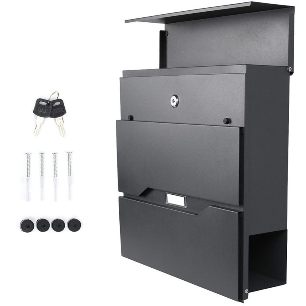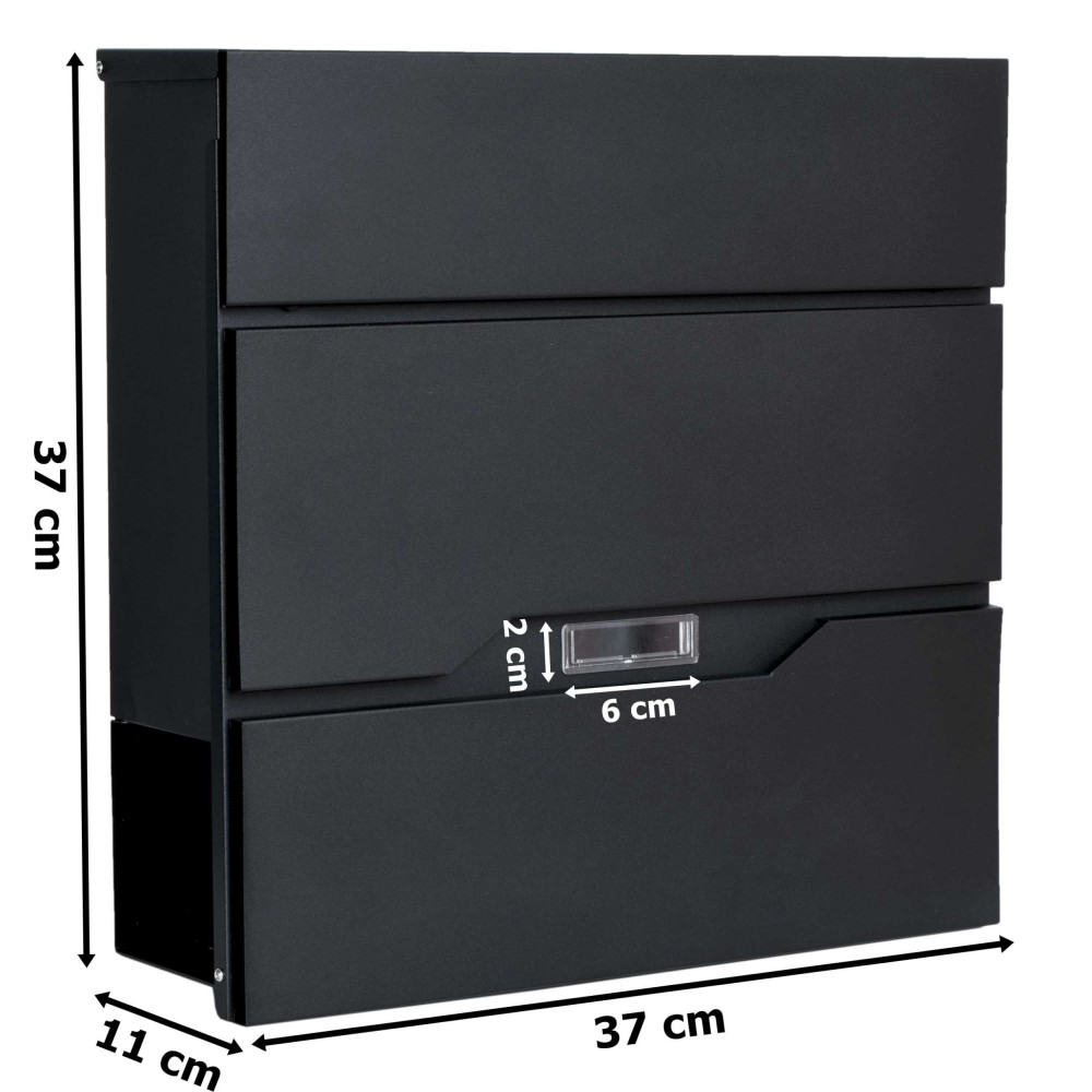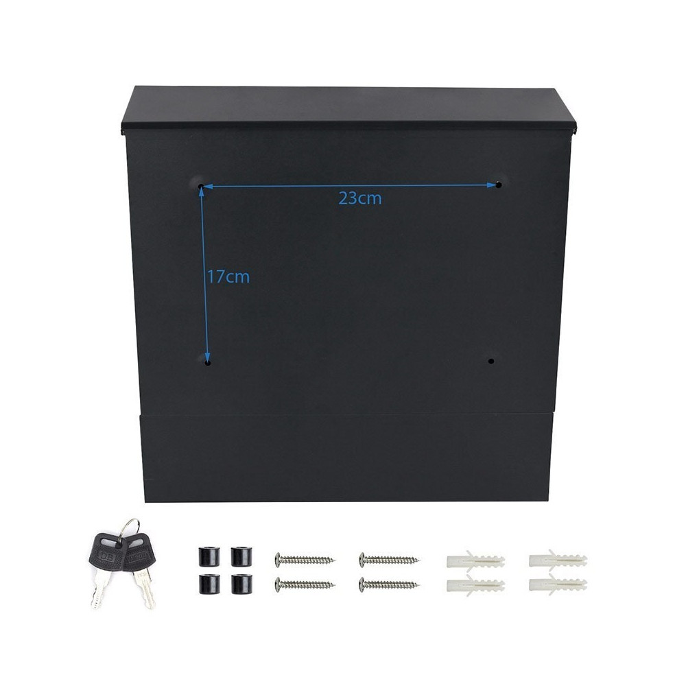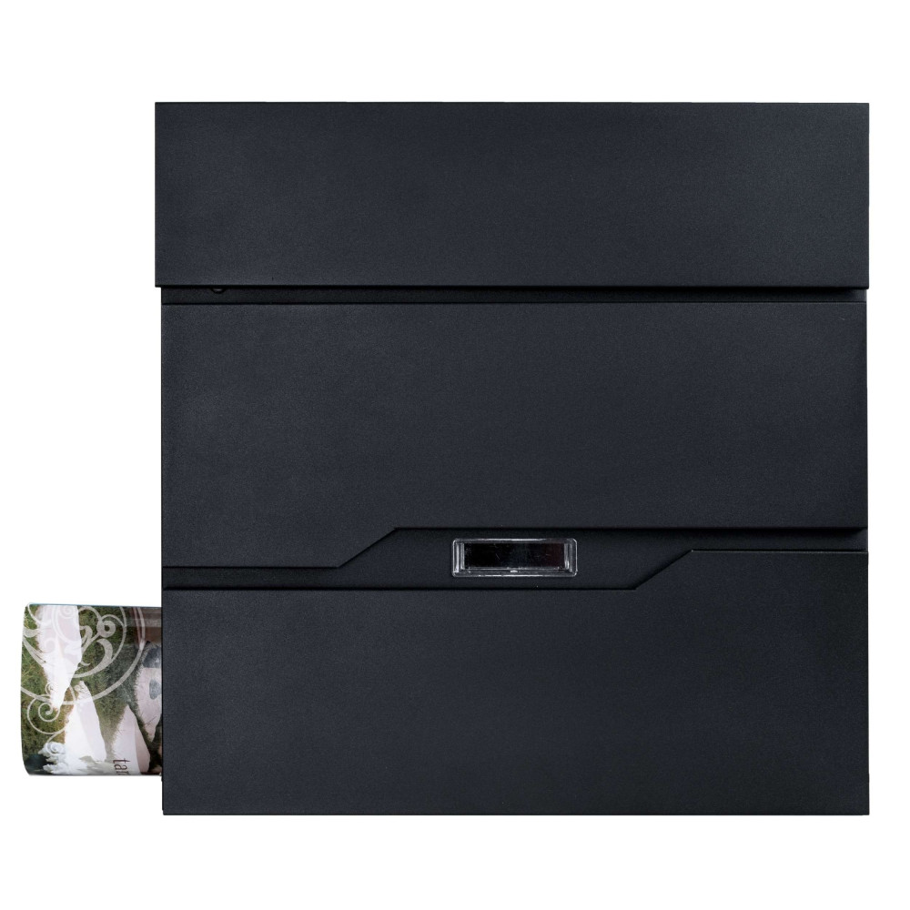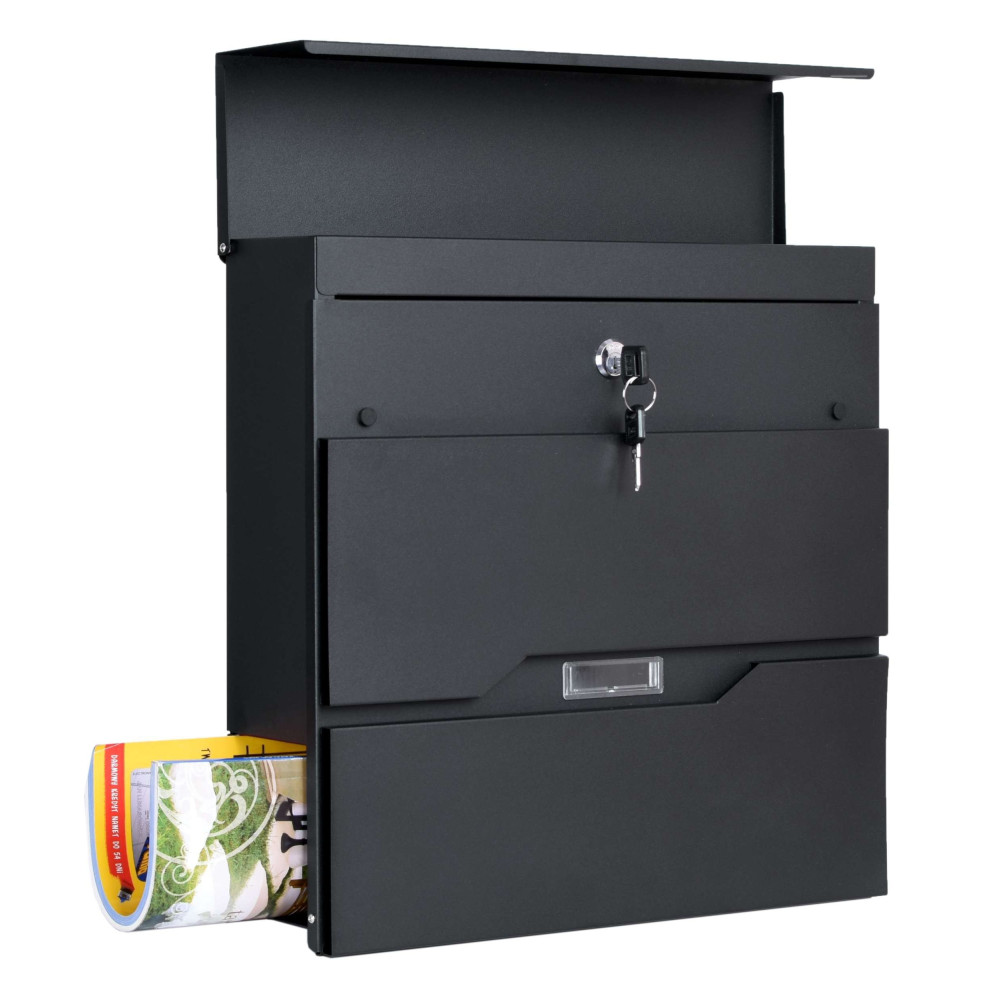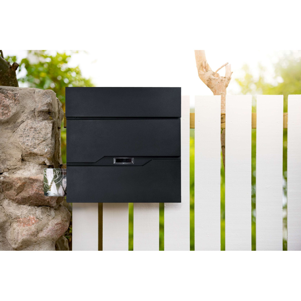 Cutie poștală de calitate din oțel galvanizat în negru. Rezistență ridicată la intemperii. A fost conceput pentru confortul utilizatorului și ținând cont de tendințele estetice actuale. Conține un compartiment suplimentar pentru ziare și pliante mai mari. Capacul superior al cutiei protejează foarte bine corespondența și lacătul de umezeală și ploaie. Sunt incluse șuruburi de montare - pentru o instalare rapidă și ușoară. Cutia are orificii de montare in spate.