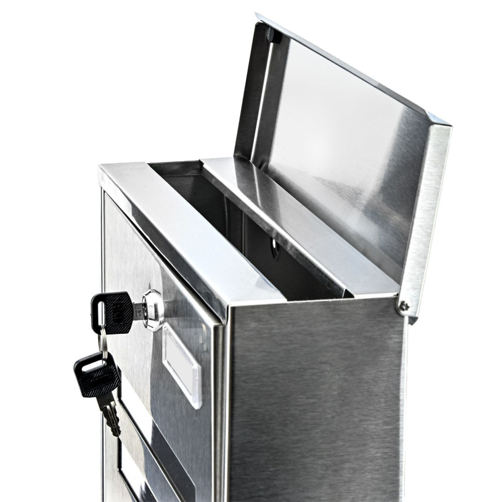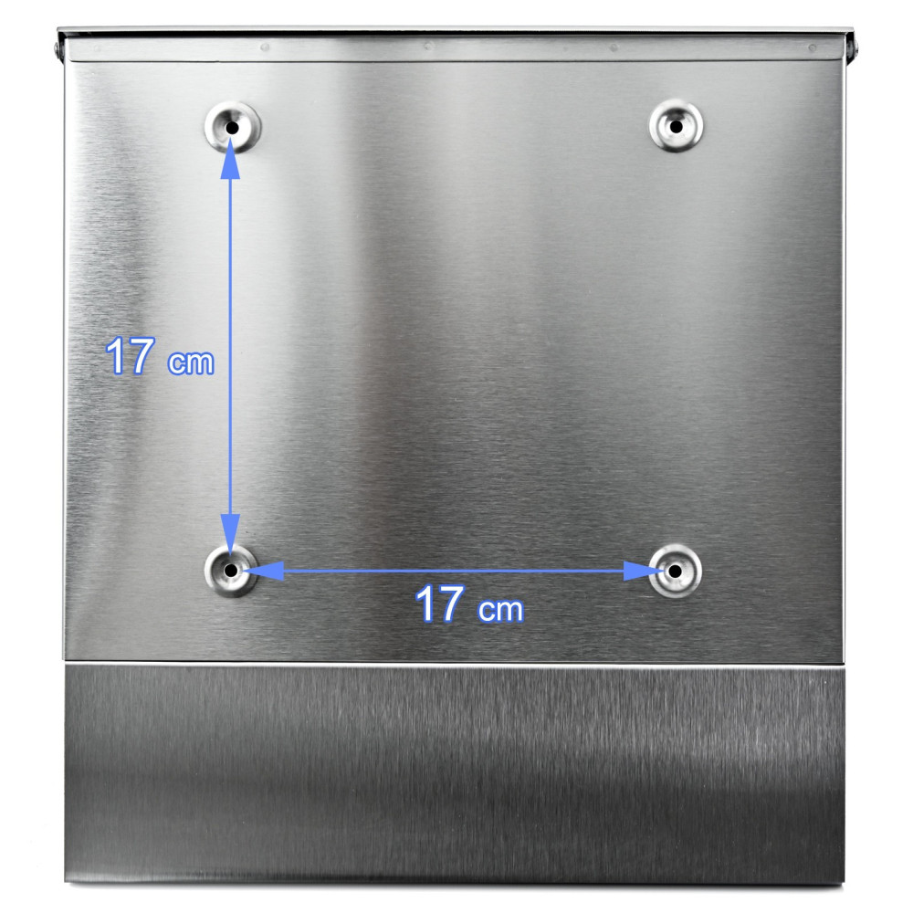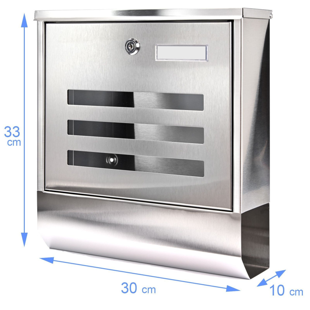 Cutie din oțel inoxidabil de înaltă calitate. Oferă confort utilizatorilor datorită celor 3 ferestre longitudinale proiectate, cu posibilitatea de a vedea în interiorul cutiei. Această caracteristică vă permite să verificați conținutul clipboard-ului, fără a fi necesar să îl deschideți de fiecare dată. Verificați doar partea din față și nu uitați să vă ridicați poșta. Cutia este echipată cu un tub inferior pentru ziare și pliante (adesea tipărite într-un format mai mare).