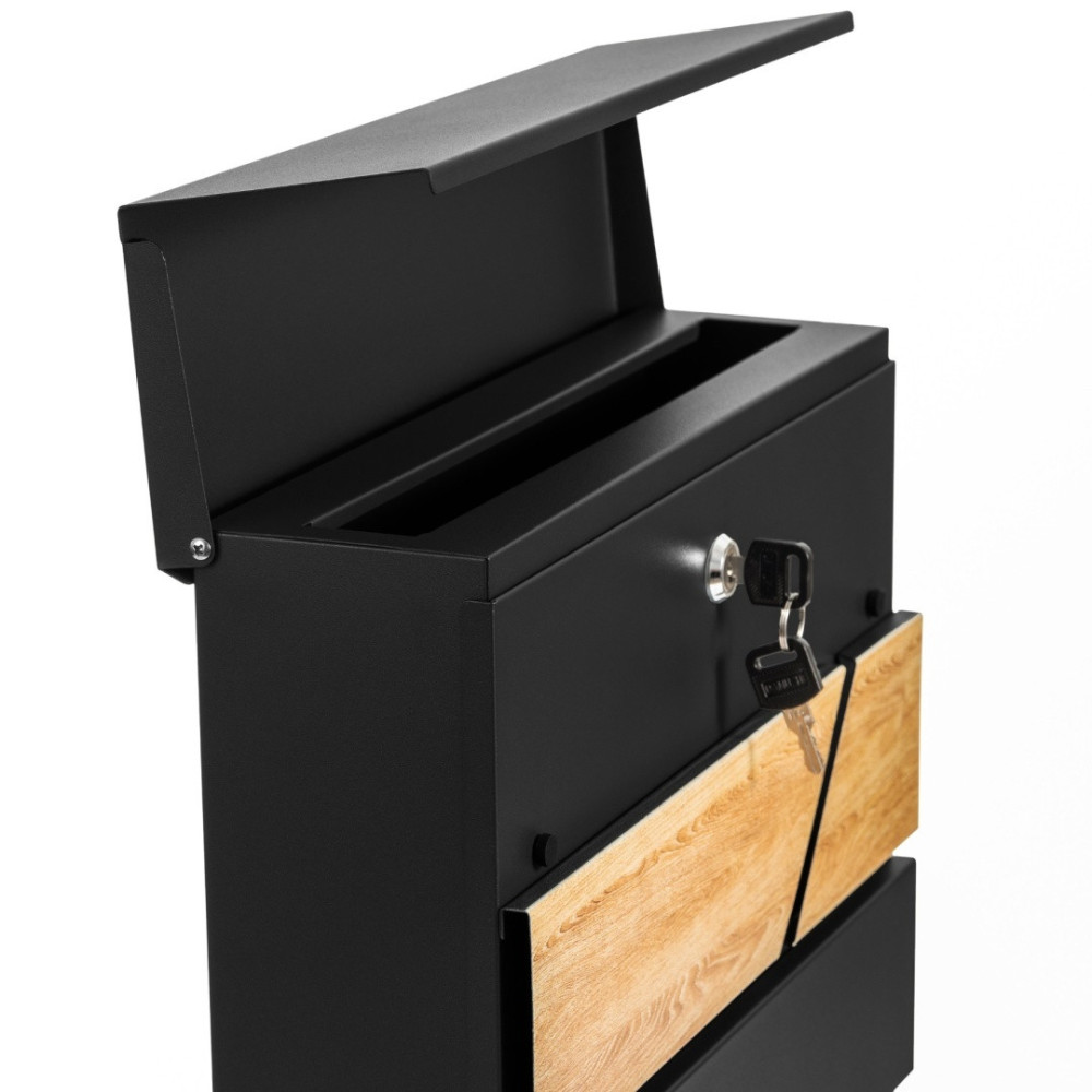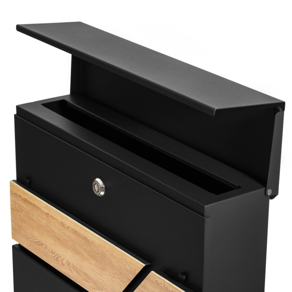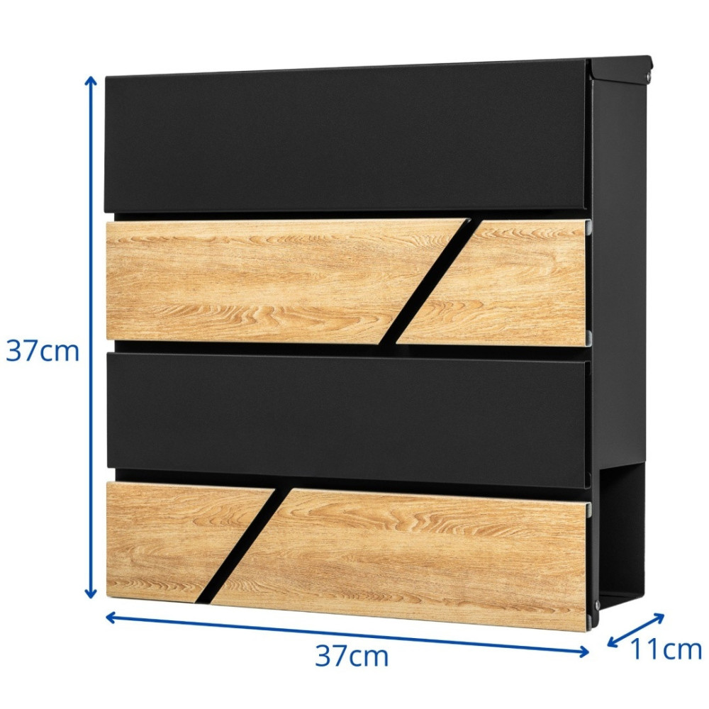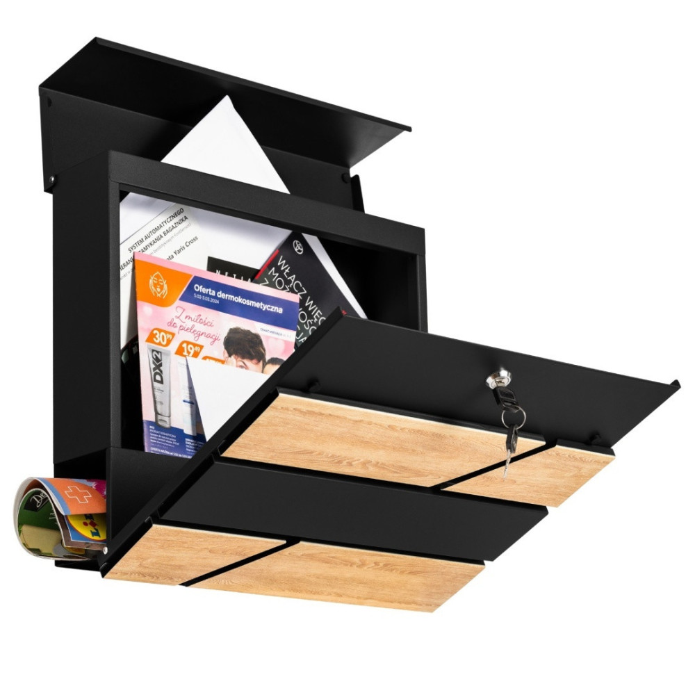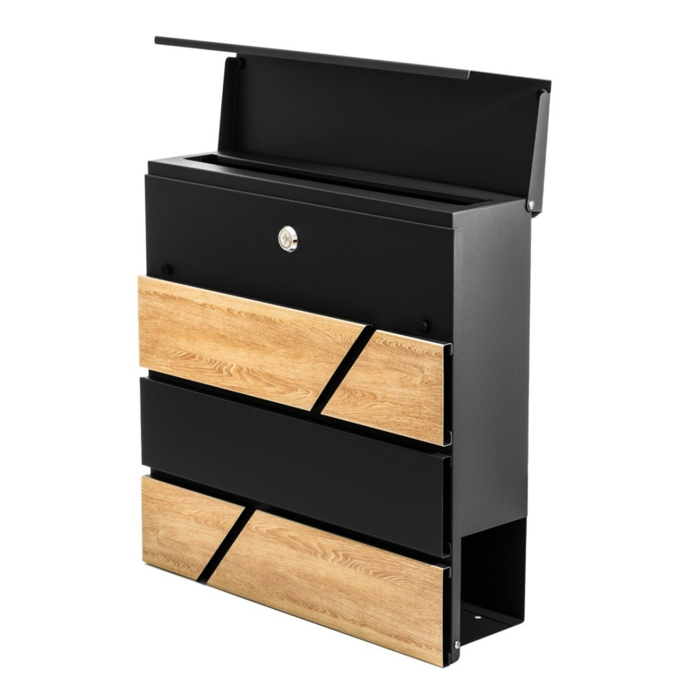 Cutie poștală din oțel galvanizat, vopsită în câmp electrostatic în culoare neagră + imitație de lemn, cu compartiment suplimentar pentru ziare.